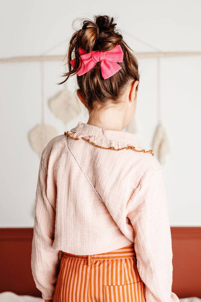 A large candy pink bow, its clean lines will bring elegance to princesses' hairstyles! Sewn on a 6 cm crocodile clip, it can slide to the side or add a trendy touch to buns or ponytails.
